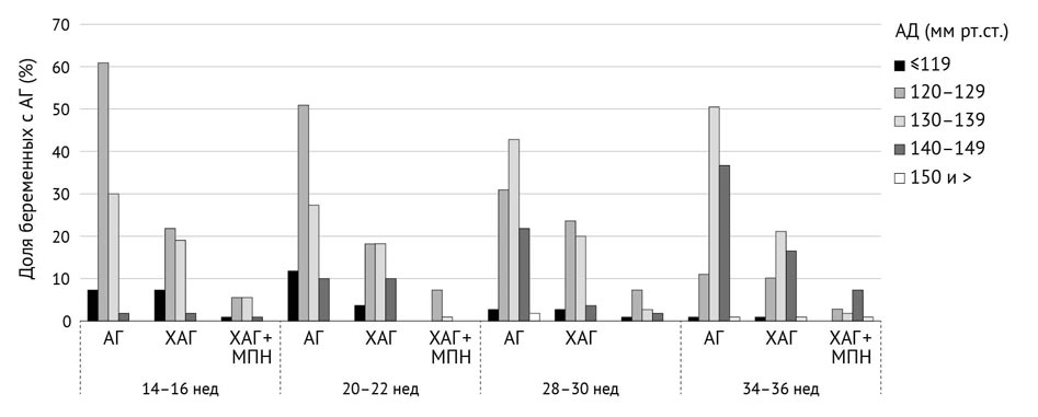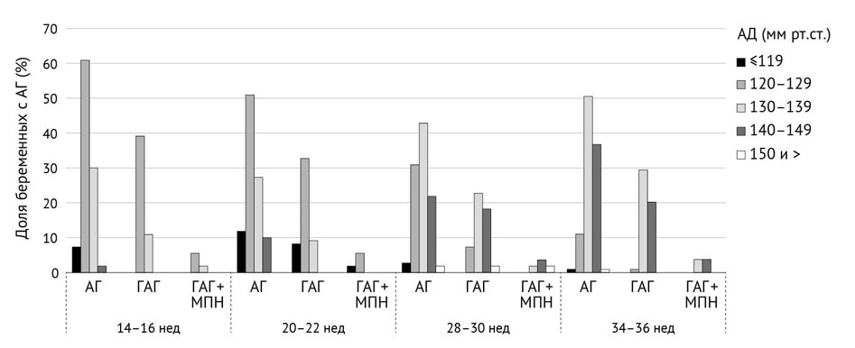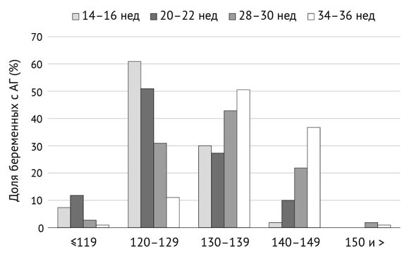 Рис. 1. Распределение беременных с артериальной гипертензией (АГ) в зависимости от сроков гестации и уровня артериального давления (мм рт.ст.)