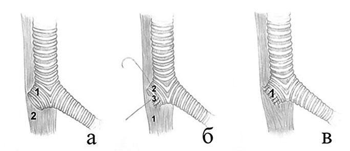 Рис. 1. Способ предупреждения несостоятельности швов культи бронха: а — культя бронха (1), уровень пищевода для пластики (2); б — мышечная стенка пищевода (1), хрящевая часть бронха (2), мембранозная часть бронха (3); в — наложенные узловые швы с «подхватыванием» стенки пищевода и закрытием культи главного бронха в виде «капюшона» (1)