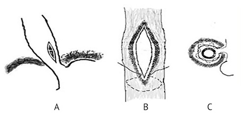 Рис. 1. Схема наложения кисетного внутрипросветного шва на слизистую оболочку пищевода через дефект его стенки.