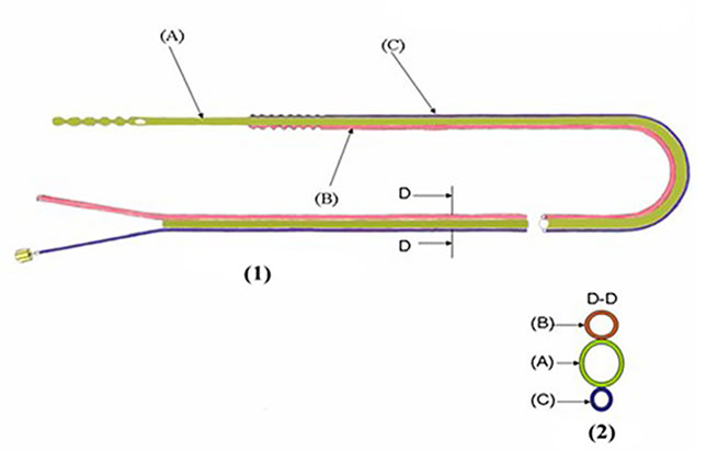 Для обеспечения адекватного дренирования и санации просвета нижней трети грудного отдела пищевода, а также для энтерального питания больного мы разработали трёхпросветный многофункциональный назоэзофагогастральный зонд, состоящий из трёх силиконовых трубок, склеенных между собой по продольной оси. Первая трубка (А) диаметром 10 Fr по шкале Charriere служит назогастральной частью зонда и обеспечивает энтеральное питание больного. Вторая трубка (В) диаметром 4 Fr предназначена для аспирации содержимого из пищевода. Третья трубка (С) диаметром 1 Fr служит инспирационной частью и обеспечивает ирригацию антисептической жидкости в просвет пищевода.