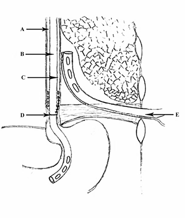 Трубки соединены таким образом, что дистальные концы второй и третьей трубок находятся на расстоянии 22 см от дистального конца первой трубки. На дистальном конце трубки А есть 10 отверстий по всей окружности трубки, и, что особенно важно, данный участок должен находиться в желудке. На дистальных концах трубок В и С есть 8–10 отверстий, расположенных на свободных боковых поверхностях. Дистальные концы трубок В и С должны располагаться на уровне зашитой раны пищевода (рис. 2, 3).