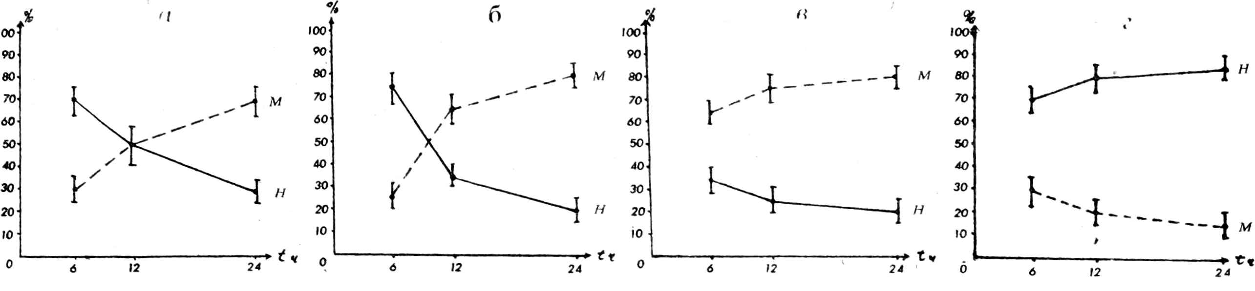 Рис. 1. Миграционная активность лейкоцитов: а) у здоровых лиц, б) у больных ревматоидным артритом с первым вариантом изменений, в) со вторым вариантом, г) с третьим вариантом. Условные обозначения: М — моноциты, Н — нейтрофилы.
