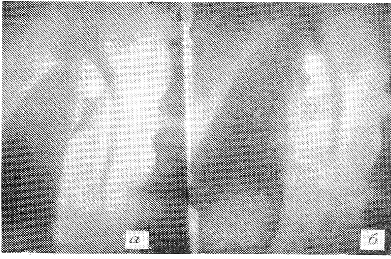 Рис. 6. Рентгенограмма желчного пузыря: а) через 120 мин; б) через 30 мин после приема желчегонного завтрака его сокращение составляет менее половины объема.