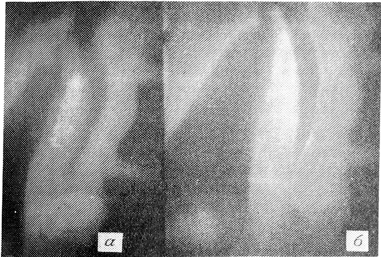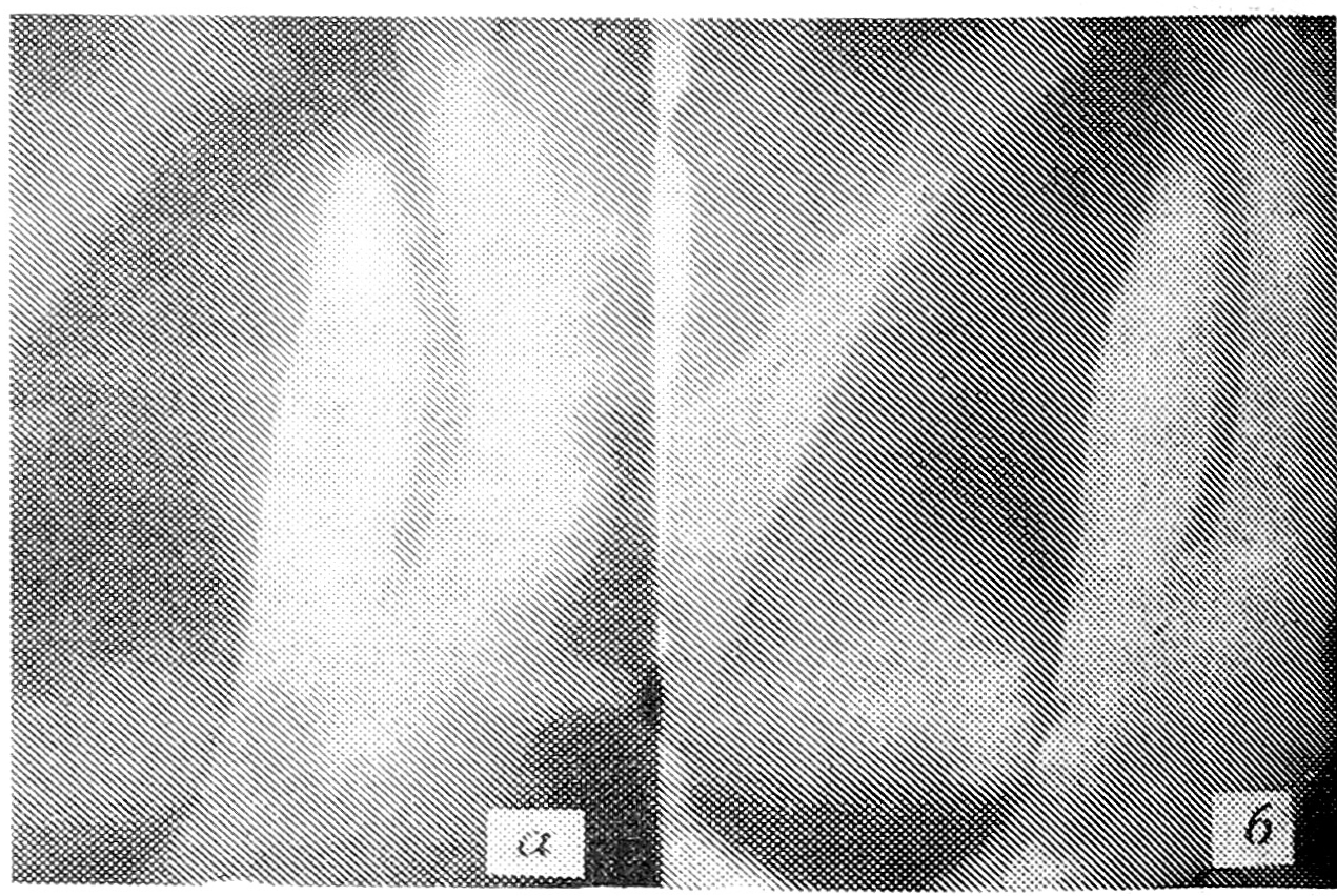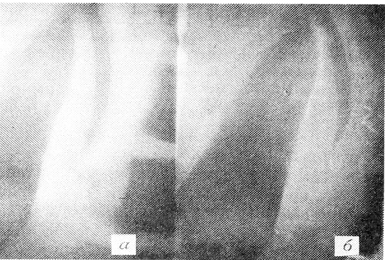 Рис. 2. Рентгенограмма желчевыводящих путей: а) через 35 мин после введения контрастного вещества. Исчезает четкость контуров холедоха, уменьшается его контрастность, пассаж в двенадцатиперстную кишку сохраняется; б) через 25 мин после приема анаприлина. Пассаж в двенадцатиперстную кишку прекратился, резко обозначились контуры терминальной части холедоха, контрастность его повысилась — момент спазма сфинктера Одди.