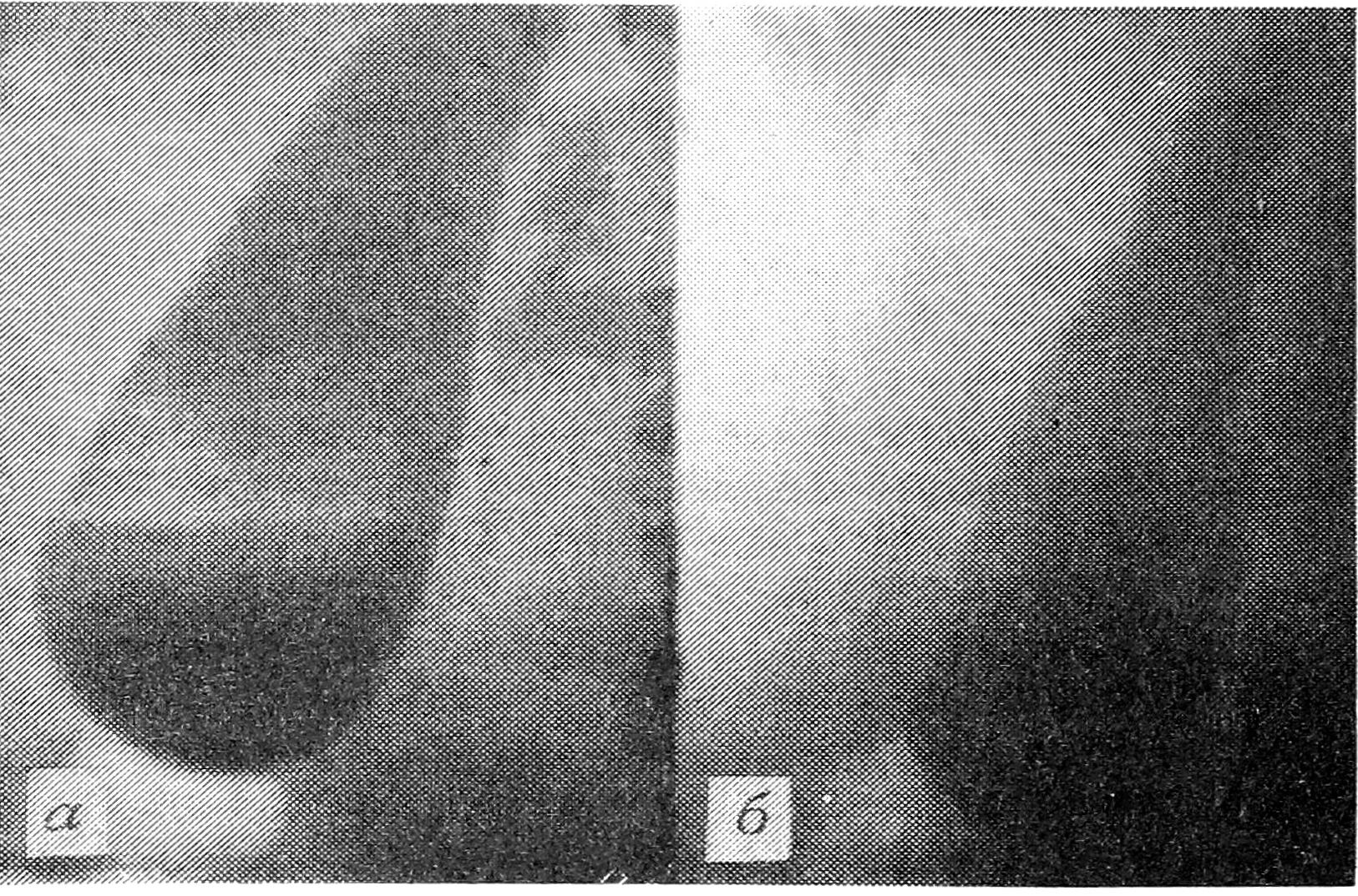 Рис. 3. Рентгенограмма желчевыводящих путей: а) через 50 мин после введения контрастного вещества; б) через 55 мин после введения контрастного вещества. Выявляется увеличение диаметра холедоха, контуры терминальной части холедоха четко очерчены, пассаж в двенадцатиперстную кишку отсутствует.