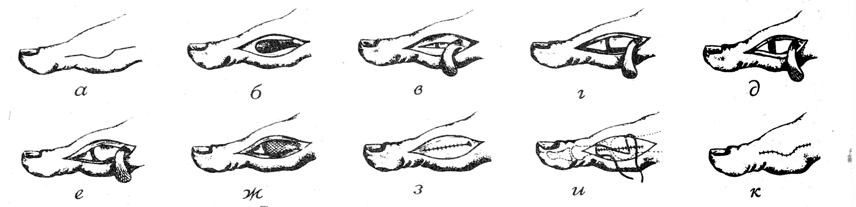Операцию выполняют под местной анестезией 50—60 мл 0,5% раствора новокаина. По внутренней поверхности I плюснефалангового сустава производят дугообразный разрез кожи и подкожной клетчатки длиной 5—6 см выпуклостью книзу (рис. 1 а). Мобилизуют края раны, при наличии бурсы последнюю иссекают. Из поверхностного листка собственной фасции стопы выкраивают языкообразный лоскут на проксимальной питающей ножке (рис. 1 б). Рассекают продольно капсулу I плюснефалангового сустава (рис. 1 в). Выделяют головку I плюсневой кости и удаляют долотом костно-фиброзные разрастания (рис. 1 г). Резецируют головку I плюсневой кости на 1/3— 1/4 часть ее высоты в строго поперечном направлении (рис. 1 д). Культю головки моделируют до полусферической формы (рис. 1 е). Полость сустава промывают новокаином. Фасциальный лоскут на питающей ножке прижимают к губчатой поверхности сформированной культи головки I плюсневой кости на всем протяжении (рис. 1 ж). Швы на капсулу сустава (рис. 1 з). На внутреннюю поверхность I плюснефалангового сустава накладывают Z-образный капроновый или лавсановый шов с захватом дистального и проксимального отделов (рис. 1 и), затягивая шов до полного выведения I пальца в правильное положение (от 0° до 10°—12° по отношению к оси I плюсневой кости). Швы на кожу (рис. 1 к). В I межпальцевый промежуток вкладывают ватно-марлевый валик, покрывают асептической и задней гипсовой лонгетной повязкой до средней трети голени.