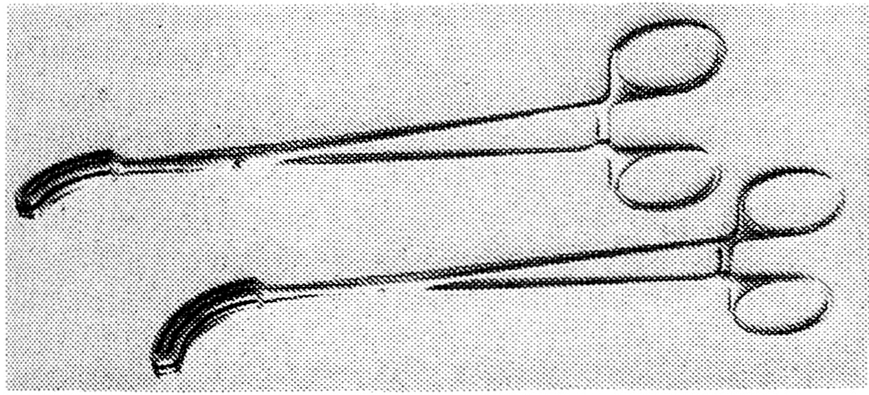Длину браншей и их изгиб следует выбирать таким образом, чтобы ручки инструмента не совпадали с осью операционного действия. Нижнюю браншу зажима для лазерного рассечения свища необходимо оснастить пуговчатым зондом, изгиб которого можно было бы менять в зависимости от хода и направления свища при его одномоментном или поэтапном рассечении (рис. 2).