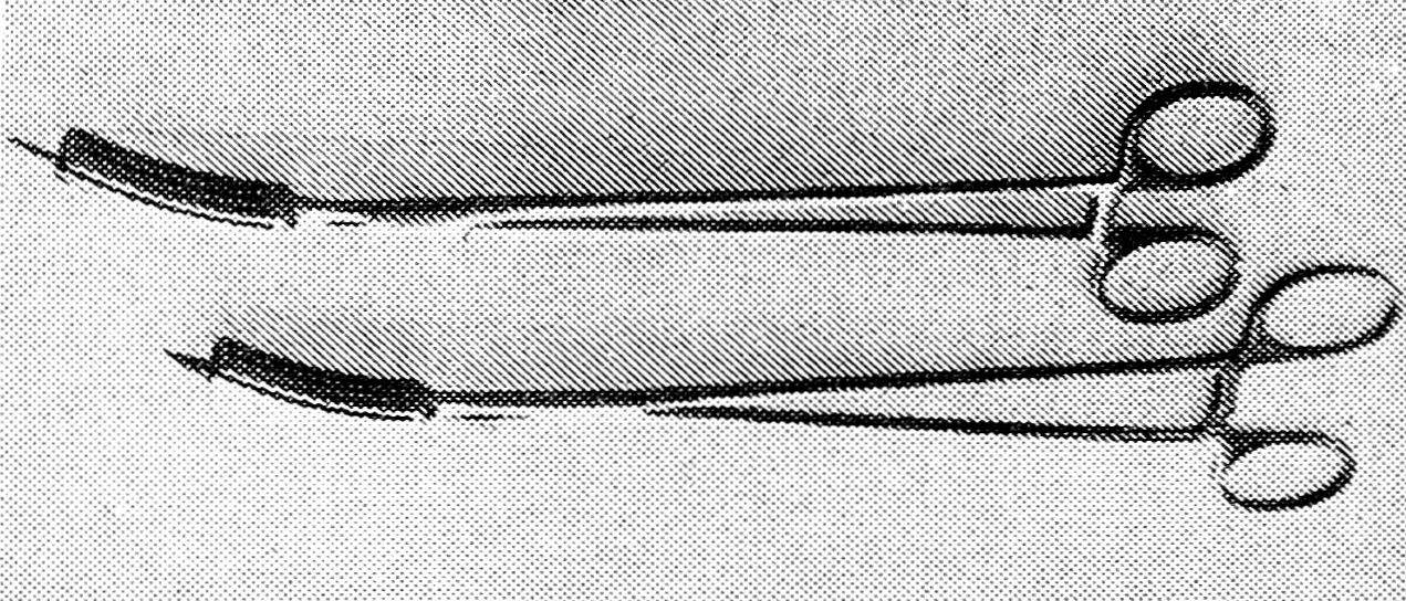 На верхней бранше зажима имеется продольное щелевидное отверстие, предназначенное для прохождения через него лазерного луча. Сплошная нижняя бранша служит экраном, предохраняющим подлежащие ткани от воздействия на них лазерного излучения.