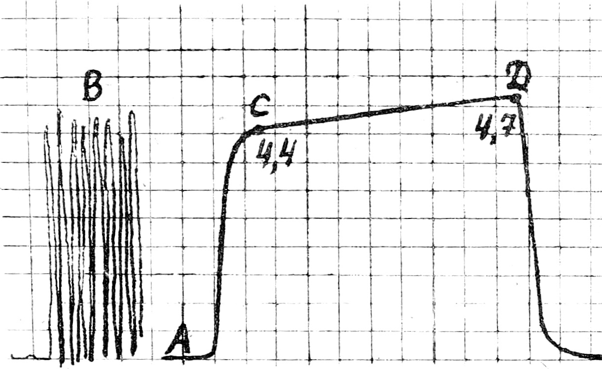 Расчет капнограмм производится по методике P. С. Винницкой и соавт. [2] в модификации В. М. Андреева и Э. Ф. Пичугиной [1] следующим способом (см. рис.). Содержание СО2 (в %) в атмосферном воздухе — точка А, в выдыхаемом воздухе в конце свободного выдоха — В, в начале и конце альвеолярной фазы выдоха — точки С и Д.