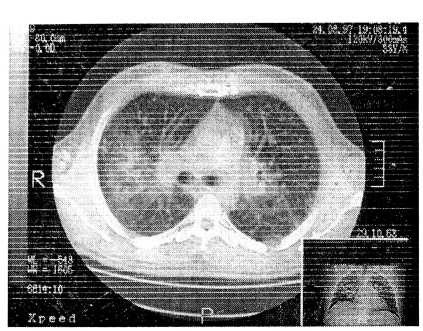 Рис. 3. Рентгеновская компьютерная томограмма больного Д., 32 лет, спустя 2 года наблюдения. Проведено лечение системными и ингаляциоными кортикостероидами. Достигнута регрессия процесса, которая была подтверждена улучшением параметров внешнего дыхания.