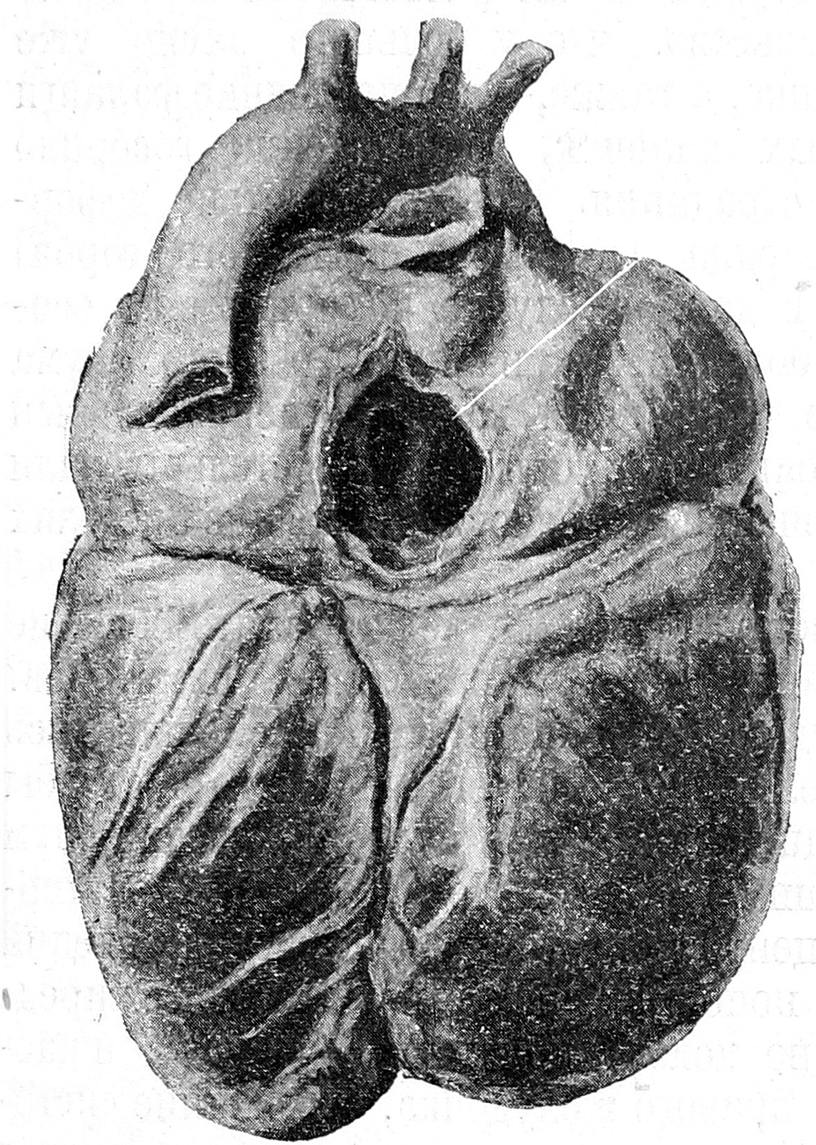 Больной пробыл у нас недолго, жалуясь на сильную слабость, на боль в области груди, одышку, кашель с кровавой мокротой, и уже 18/IV скончался при явлениях наростающей слабости сердца и резкой одышки. При вскрытии (д-р А. В. Голяев) оказалось, что правая половина грудной клетки несколько выдается по сравнению с левой, околосердечная сумка содержит 50,0 светло-желтой прозрачной жидкости, сердце (см. рис.) имеет две отчетливо развитые верхушки, передняя борозда его несколько углублена, длина левого желудочка—8,8 см., правого—9,8 см., ширина всего сердца—12,0 см. Лежит сердце симметрично по средней линии, приблизительно на 2 поперечных пальца от грудины в обе стороны. Крупные сосуды у верхнего края И ребра. Венозные отверстия пропускают слева 2 пальца, справа— 3. Овальное отверстие открыто. Артериальные отверстия воду удерживают. Эпикард гладкий, прозрачный, содержит очень мало жира. Полости сердца содержат густые темнокрасные сгустки. Венозные клапаны слева утолщены, по краям гладки, сухожильные нити тонки. Аорта узка, стенка ее тонка, эластична, внутренняя оболочка гладка и чиста. Об остальных данных, полученных при вскрытии, можно составить представление из эпикриза, которой гласил: plagiocephalia, thymus per listens, cor biapiculare, dilatatio ethypertrophia cordis dex., dilatatio art. pulmonalis, hypoplasia aortae, foramen ovale apertum, induratio cyanotica lienum, tbc petrificata lymphoglandularum bronchialium sin., obliteratio pleurae bilateralis, tbc acinoso-nodosa productiva pulmonis utriuscpie lobi superioris, broncho-pneumonia acuta lobi inférions sin., catarrhus cyanoticus ventriculi et intestinorum, apoplexia pancreatis, hyperaemia passiva hepatis et renum.