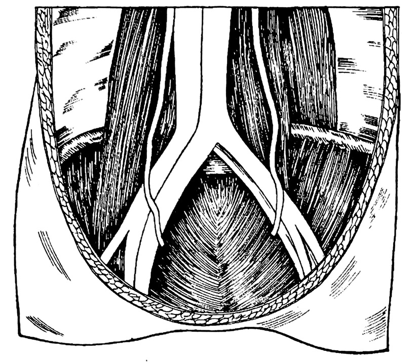 С целью формирования инвагинационного уретерокишечного анастомоза после инверсии илеоцекального сегмента на 180° приступаем к созданию инвагинационного уретроасцендоанастомоза, заключающегося в погружении культи мочеточника в просвет кишки. Осуществляем это в двух вариантах. При первом варианте шовную полосу инвагинируем вплоть до уровня крайнего сохраненного прямого сосуда. Для этого на расстоянии около 3 см от резекционной линии уретры и задней стенки восходящей кишки накладываем узловые серозно-мышечные швы с захватом мягких тканей по задней поверхности уретры.