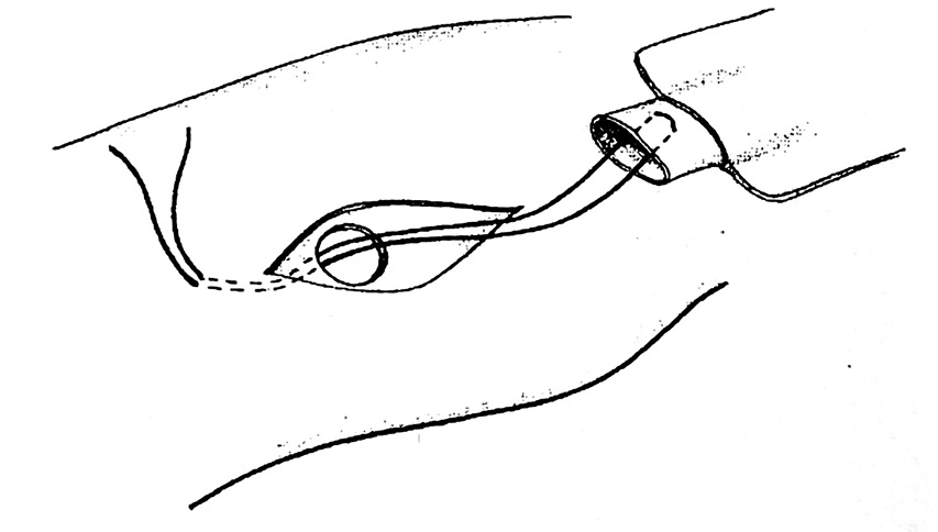 Культю мочеточника на протяжении 1,5— 2,0 см освобождаем от брюшины и прошиваем узловыми швами. Формируем серозномышечный тоннель в подвздошной кишке и путем электрокоагуляции образуем небольшое отверстие в слизистой кишки размерами до 0,5 см. Проводим инвагинацию мочеточника с мочеточниковыми катетерами в просвет подвздошной кишки с помощью П-образных инвагинирующих швов (рис. 3). Накладываем узловые фиксирующие швы между брюшиной мочеточника и краем серозномышечного канала подвздошной кишки.