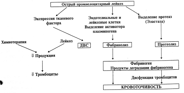 Коагулопатия у больных миелобластным лейкозом, в частности острым промиелоцитарным лейкозом, часто является комплексной и состоит из классического синдрома ДВС [2, 4], системного фибринолиза и гемостатических сосудистых нарушений, вызванных протеолитическими ферментами, например лейкоцитарной эластазой.