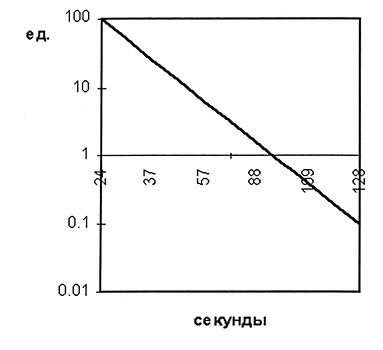 Рис. 2. Калибровочный график. По оси ординат — активность тканевого фактора в единицах в логарифмической шкале. По оси абсцисс — время свертывания в секундах.