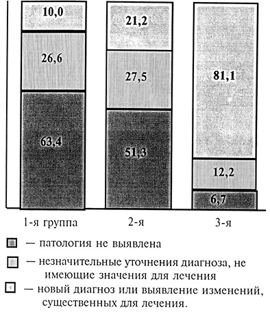 Конечные результаты анализа представлены на рис. 1. У большинства больных 1-й группы были первый и второй варианты — 90,0±2,3%, то есть эффективность проведения обследования оказалась наименьшей. У больных 2-й группы первый и второй варианты составили 78,8±2,7% (Р<0,01), в 3-й группе — только 18,9±2,3% (Р<0,001). Число больных 3-й группы, у которых конечные результаты обследования имели существенное значение для постановки диагноза и лечения, составило 81,1±2,3%, во 2-й 21,2±2,7%, в 1-й 11,0±2,4% с вероятностью ошибки не более Р<0,001.