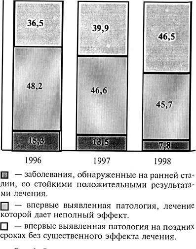 Как видно из рис. 2, за 1995—1998 гг. в структуре впервые выявленных в диагностических центрах патологических состояний произошли существенные изменения. Так, частота первой группы заболеваний снизилась в 2 раза, второй — осталась относительно стабильной (в пределах 48,2—45,7%), третьей — значительно повысилась (на 10%).