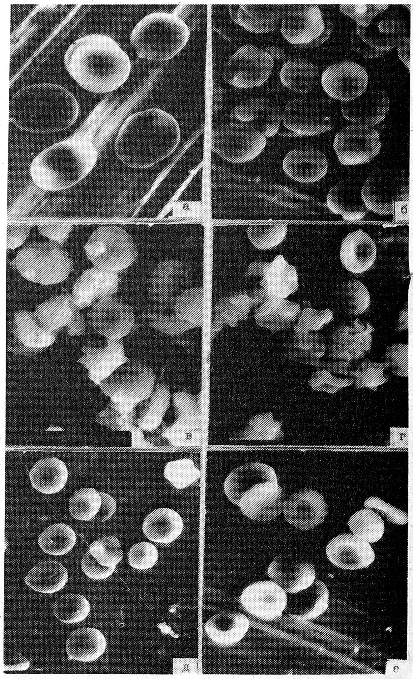 Рис. 1. Изменение поверхности и формы эритроцитов кролика при экспериментальном тромбозе и под действием террилитина. Сканирующий микроскоп. а, в, г, д, е— X 4000; б— X 3000.