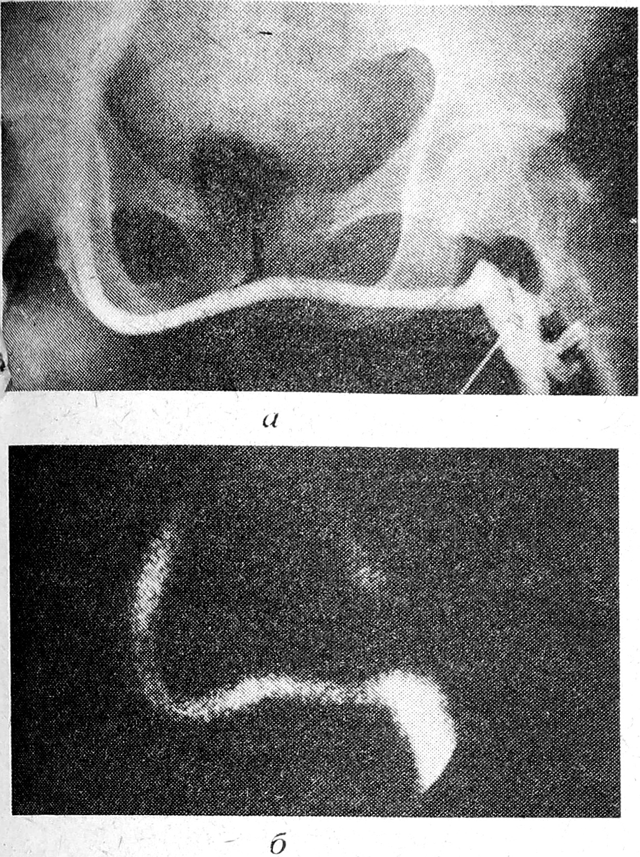 Рис. 1. Флебограмма перекрестного бедренно-бедренного аутовенозного шунта: а) рентгеноконтрастная, б) радиоизотопная.