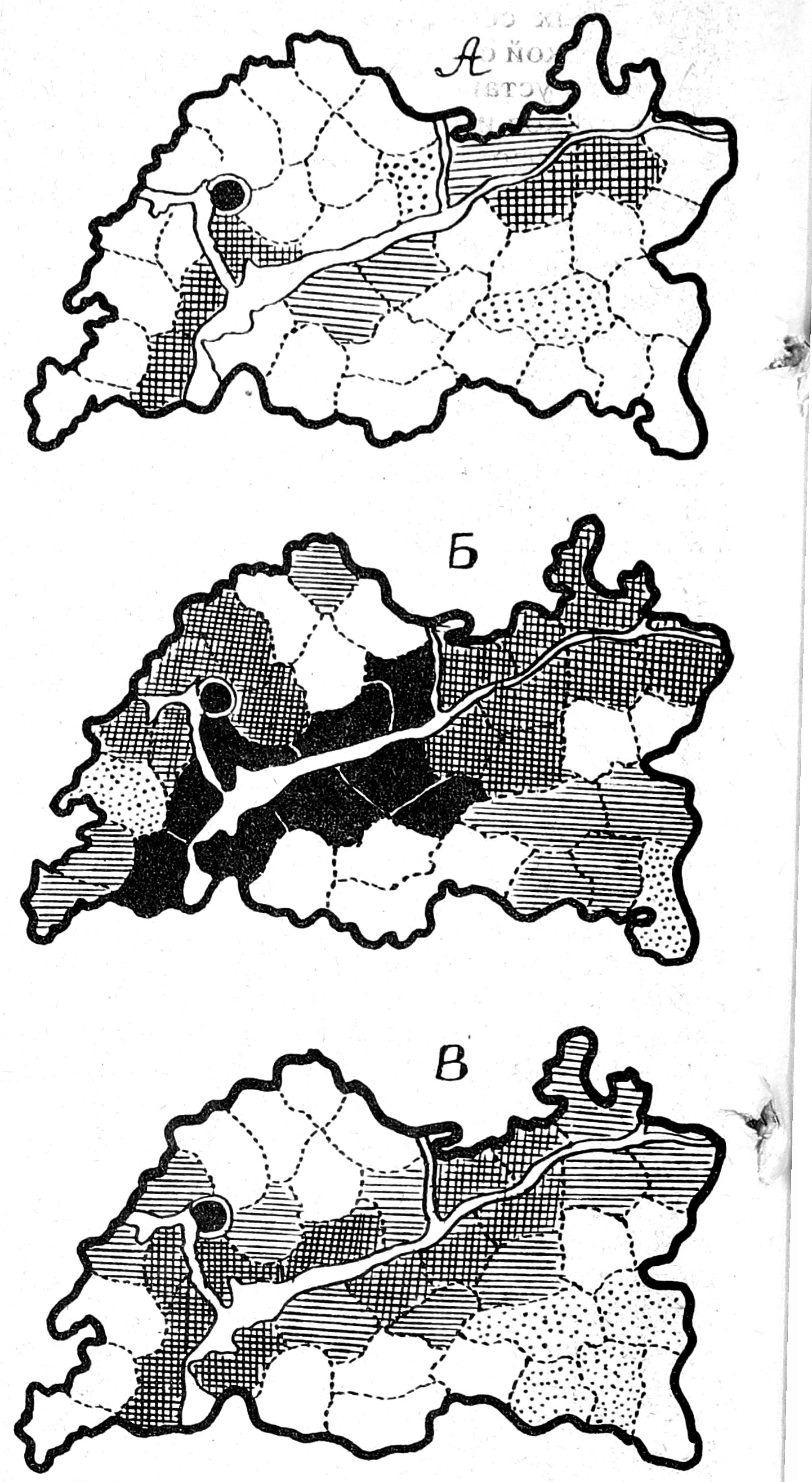 Рис. 1. Изменение уровня пораженности дифиллоботриозом населения разных районов ТАССР. А — 1957 г.; Б — 1963 г.; В — 1986 г. Условные обозначения: незаштрихованные участки — 0, заштрихованные точками — 0,001—0,01, горизонтальными линиями — 0,01—0,1, перекрещивающимися линиями — 0,1—1,0, участок, закрашенный черным цветом — 1,0 и выше.