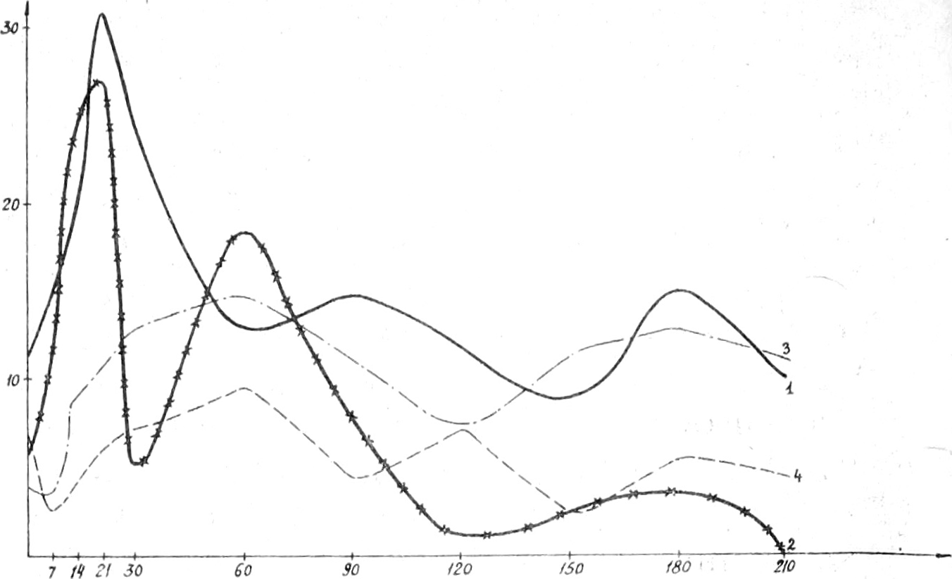 Рис. 1. Динамика содержания противококлюшных антител: тигры по РПОЛМА (1) и реакции агглютинации (2) у привитых детей; то же (3 и 4) у непривитых.