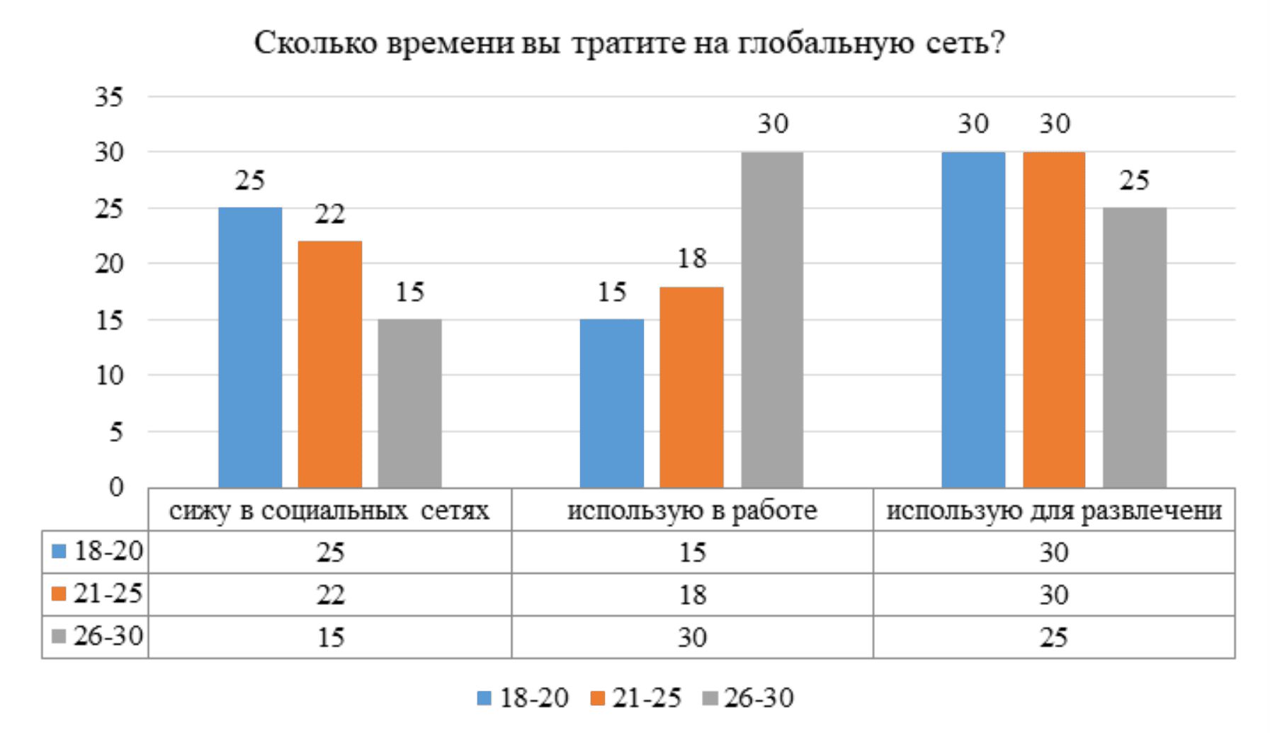 В соответствии с ответами по диаграмме 4, были выявлены различные аспекты использования глобальной сети респондентами: выявлены 3 основных направления в данном контексте – использование интернета в социальных сетях, использование сети для рабочей деятельности, использование глобальной сети для развлечения. Вышла соответствующая корреляция, когда принципы пользования менялись в соответствии с возрастными характеристиками. Единственный момент, который не имел сильного изменения в системе, это использование глобальной сети для развлечения. Именно данный контент является наиболее уязвимой частью, где радикально религиозные группы и организации могут влиять на бессознательной основе в продвижении своих идейных платформ.