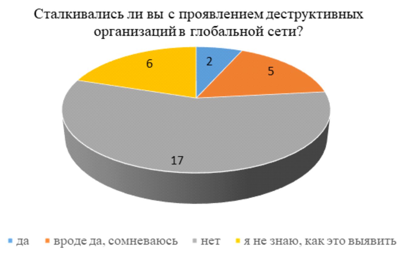 The article analyses the activities of destructive religious groups on the global Internet. In many ways, this issue has become relevant with the development of new technologies in general and in the information sphere in particular. The purpose of the work is to show the level of dangerous influence of destructive religious groups in the global Internet. The paper shows a theoretical analysis of the topic, as well as the results of a small sociological survey. Within the framework of this analysis, the level of danger of the global network and the methodology of work of public authorities in this area was identified.
