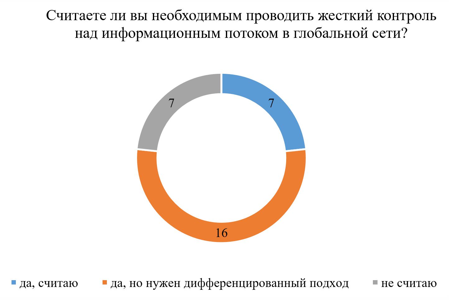 В заключении представим результаты социологического опроса проведённого на базе Евразийского Национального университета имени Л.Н. Гумилёва. В рамках исследования было опрошено 30 человек, по следующим вопросам: «Сколько времени вы тратите на глобальную сеть», «Сталкивались ли вы с проявлением деструктивных организаций в глобальной сети», «Считаете ли вы необходимым проводить жёсткий контроль над информационным потоком в глобальной сети» (диаграммы 4-6).