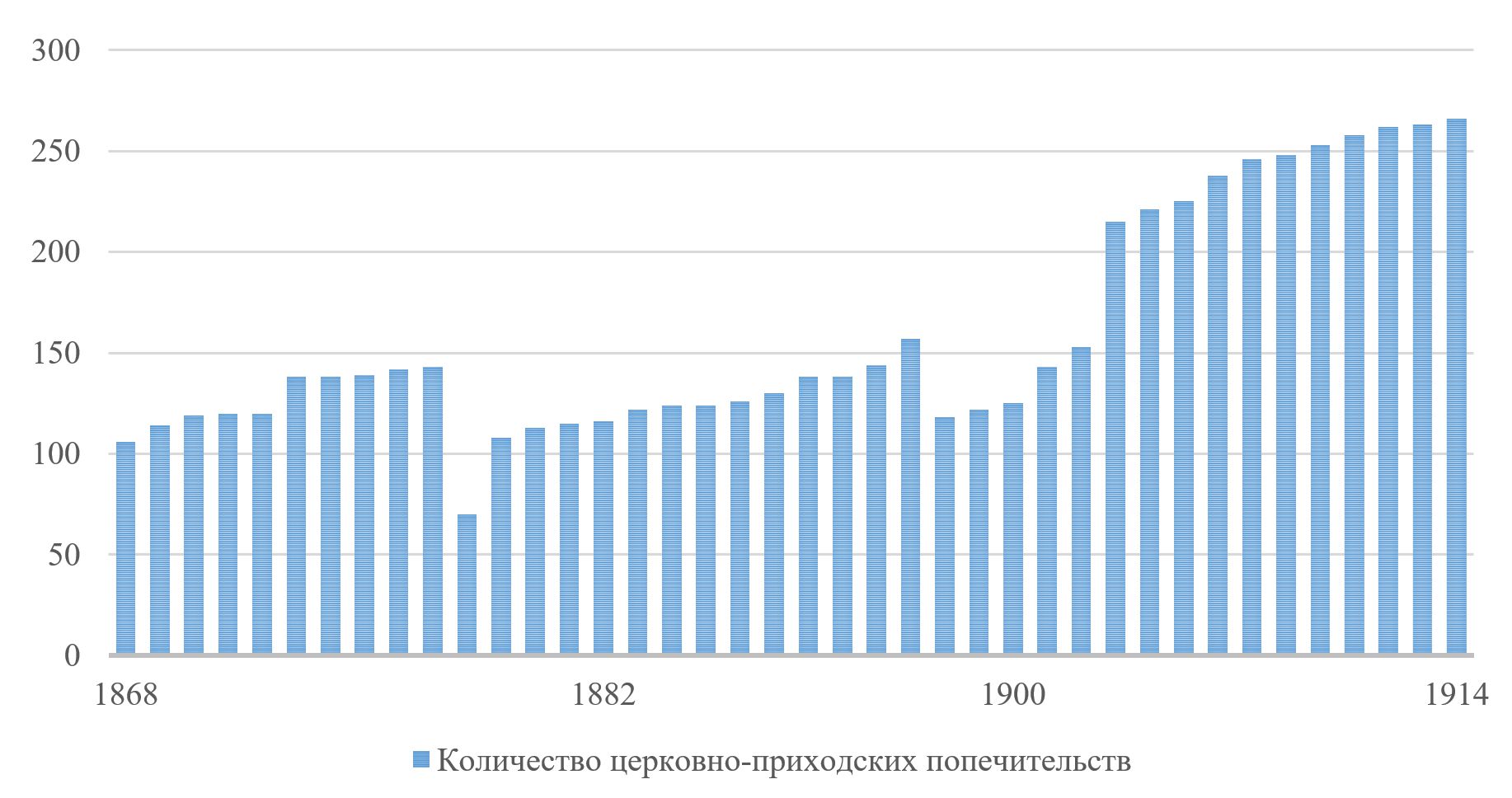 На рисунке 1 представлена динамика изменения численности церковно-приходских попечительств Тобольской епархии 1868-1914 гг.