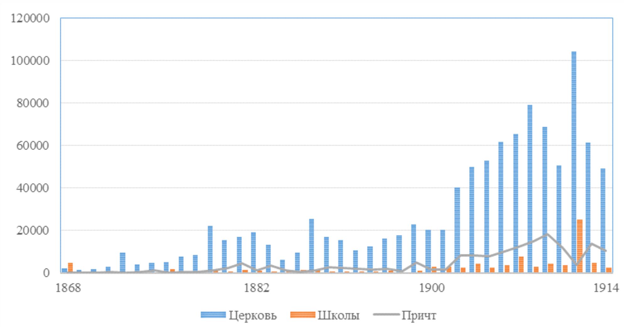 Из представленных данных видно, как изменялась динамика расходования денежных средств приходскими попечительствами Тобольской епархии. Расходы на украшение церкви постоянно возрастали в денежном эквиваленте, их максимальное значение установилось на отметке в 104 тыс. рублей в год – это огромная сумма. На примере подобных расходов видно, каким образом распределялись приоритеты среди прихожан целевых пожертвований на приходскую деятельность. Эти расходы смотрятся особенно неравномерно, если сравнивать их с расходами на содержание священно-церковнослужителей – на эти цели прихожане не особо горели желанием совершать пожертвования. С учетом географических и климатических условий расположения Тобольской епархии, бедности ее населения приходские попечительства не смогли выполнить намеченных законодательством инициатив. Несмотря на возрастающие расходы приходских попечительств основная забота прихожан состояла в благоукрашении храмов и удовлетворении хозяйственных нужд прихода, о чем ярко свидетельствуют отмеченные выше случаи, упоминавшиеся в епархиальных ведомостях.