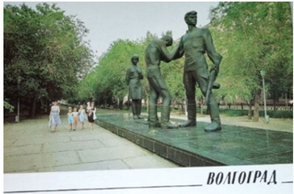 Представленные далее почтовые карточки датированы 1979 г. и 1989 г., что очень примечательно с точки зрения трансляции коллективной памяти. Памятник посвящен молодым защитникам Сталинграда, ушедшим на войну во имя свободы и будущего своей страны. На низком постаменте установлены три скульптурные фигуры – молодые бойцы скорбят о погибшем товарище. Временной промежуток открыток – 10 лет, но спустя это время их информативная составляющая не изменилась, жители Волгограда по-прежнему посещают данный мемориал, показывают его подрастающему поколению, тем самым сохраняя и пронося сквозь время эту память.