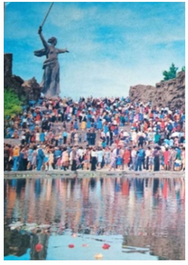 Событийный ряд продолжают открытки, датированные 1979 г. и 1981 г. Они заключают в себе информацию о значимом для Волгограда и для всей страны монумента, главной высоте России, которая своими величественными основами подчеркивает величие подвига советских солдат. На зафиксированных кадрах представлены толпы людей, идущих к подножию Мамаева Кургана. Это и есть трансляция и прямое отражения коллективной памяти граждан, сплоченной одной историей в рамках одного государства в городе, совершившем легендарный подвиг.