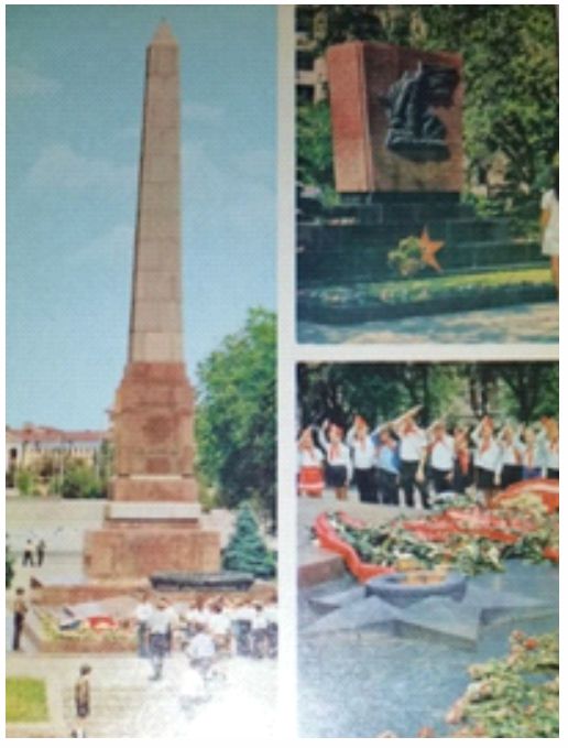 Завершают фоторяд открытки 1965 г. и 1973 г. с уже другим зафиксированным объектом культурного наследия. Это обелиск, возвышающийся над братской могилой в память погибших в Гражданской войне защитников Красного Царицына и память советских солдат, павших во время Сталинградской битвы. Почтовые карточки фиксируют образ величественной стелы и жителей города, выражающих дань памяти и уважения героям.