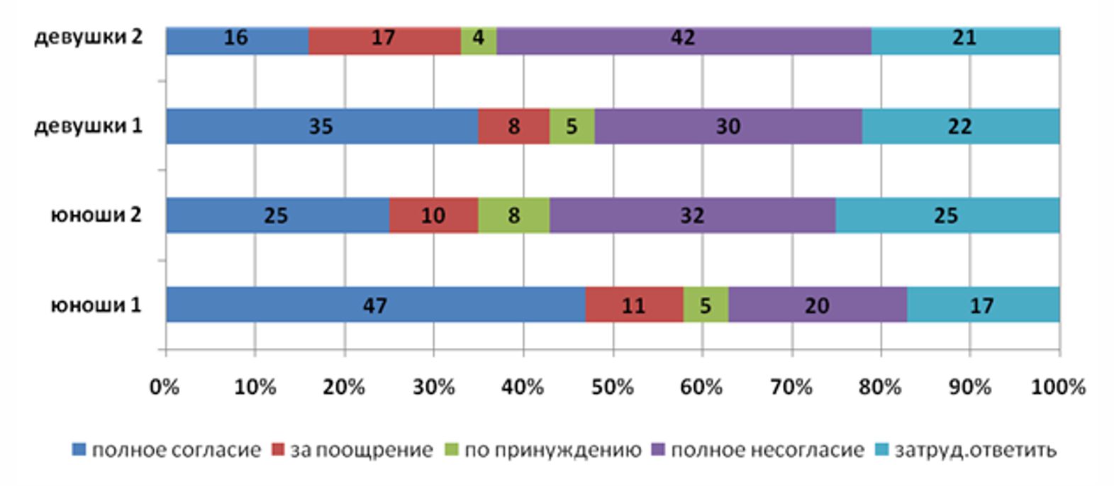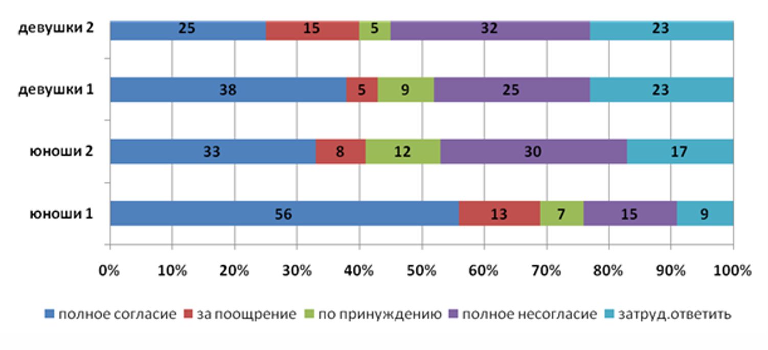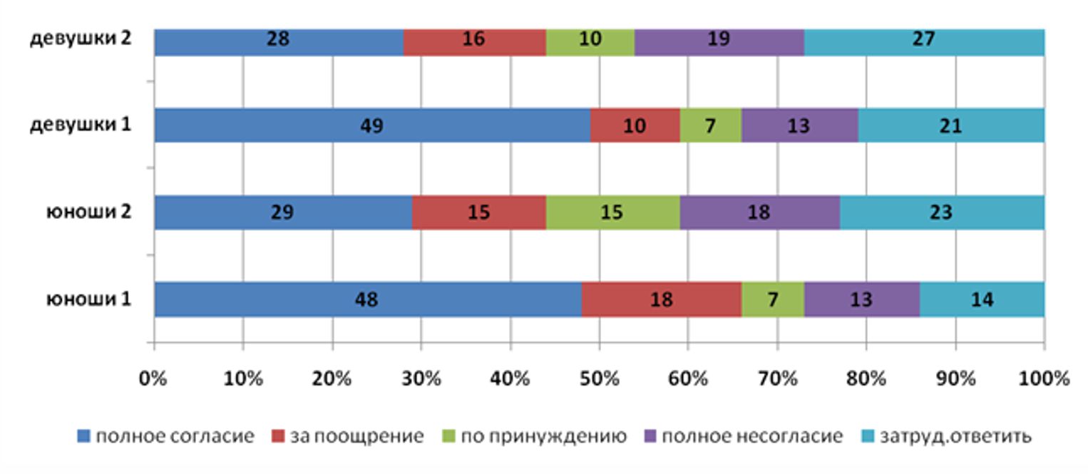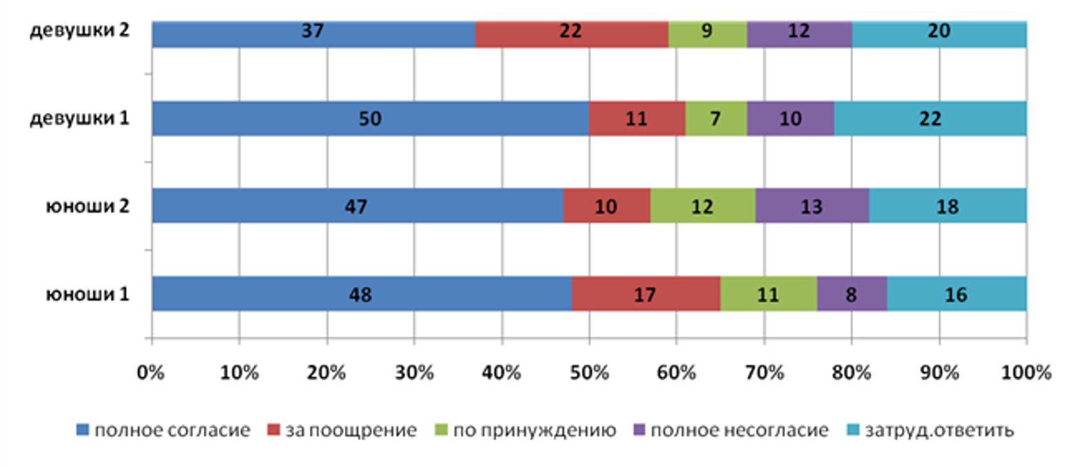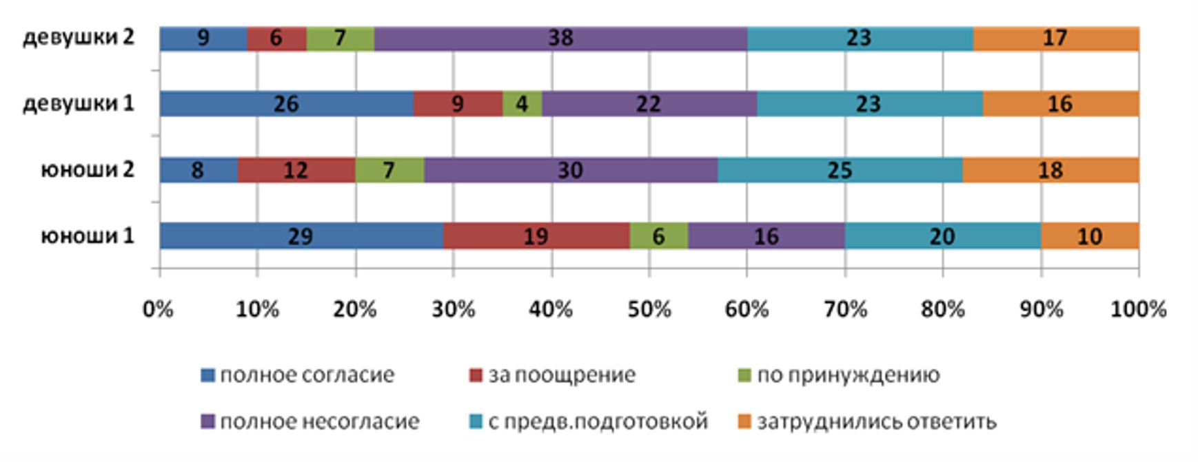 Политика правительства нашей страны, направленная на популяризацию физкультурно-спортивных мероприятий, спортивных массовых акций и комплекса ВФСК ГТО среди населения, существенно не отразилась на количестве молодых людей, официально участвовавших в мероприятиях по выполнению нормативов физической подготовленности. Среди молодых людей, вовлеченных в рекреационную физкультурно-спортивную деятельность, участвовали в сдаче нормативов ГТО 48% юношей и 46% девушек, а среди их физически малоактивных сверстников этот показатель составил 35% и 20% соответственно. На вопрос «Согласились бы Вы принять участие в выполнении нормативов ГТО?» больше положительных ответов было получено от юношей и девушек, занимающихся физической культурой и спортом во время досуга (рис. 1). Обращает на себя внимание факт возможного участия в этом мероприятии при условии предварительной подготовки (от 20% до 25% респондентов во всех группах).