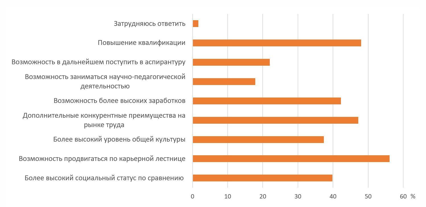 Мы также включили вопрос, «Что дает магистратура лично Вам?», ответы распределились следующим образом (можно было выбрать несколько вариантов ответа): большее количество (56,1%) респондентов отметили возможность продвигаться по карьерной лестнице; дополнительные преимущества на рынке труда выбрали 47,2% магистрантов; возможность более высоких заработков отметили 42,3% студентов; более высокий социальный статус (39,8%); более высокий уровень общей культуры (37,4%); возможность в дальнейшем поступить в аспирантуру привлекает 22% магистрантов; возможность заниматься научно-педагогической деятельностью – 17,9% респондентов; повышение квалификации (48%), 1,6% затруднились ответить на этот вопрос (рис. 4).