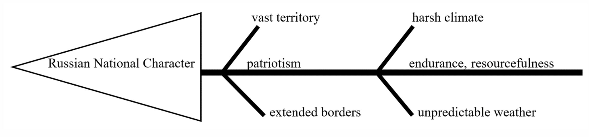 Пример номер 3 создан для стадия осмысления, здесь учащиеся обобщают прочитанную информацию, фиксируют ключевые идеи, представляя их в кратком графическом виде: Make up a list of geographical, historical, and other factors which influenced the formation of the Russian value system and national character. Arrange your findings into the table, showing the cause-effect relationship between the information in the left and in the right boxes. (You might want to add more ideas of your own).