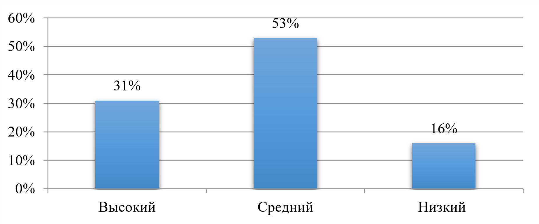 Из рисунка видно, что преобладающим уровнем организации методической работы на основе личностно-ориентированного подхода в детском саду является средний и составляет 53%. Высокий уровень составляет 31% и низкий уровень 16%.