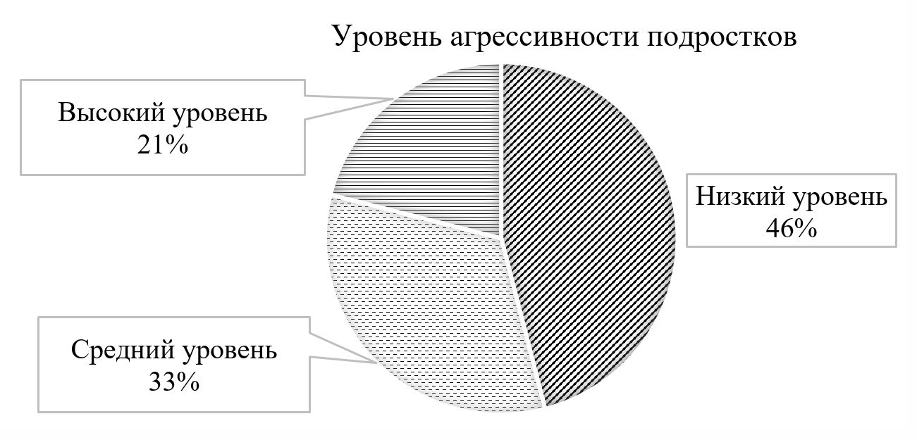 Анализ уровня агрессивности подростков свидетельствует о преимущественно низком уровне агрессивности – 46%, условно нормальный уровень показали 33% респондентов, тогда как высоким уровнем проявлений агрессивности характеризуется 21% подростков (рис. 2).
