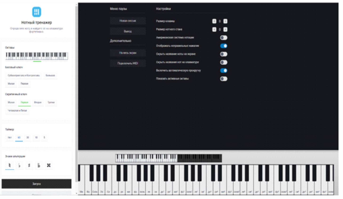 В этом тренажёре можно выбрать четыре режима: музыкальный диктант; «угадай ноту»; лад (мажор/минор); интервалы. Обучающийся будет совершенствовать музыкальный, мелодический и гармонический слух, улучшить чувство метроритма, развивать ладовое мышление. Кроме того, обучающиеся смогут лучше закрепить знание записи нот в скрипичном и басовом ключе.