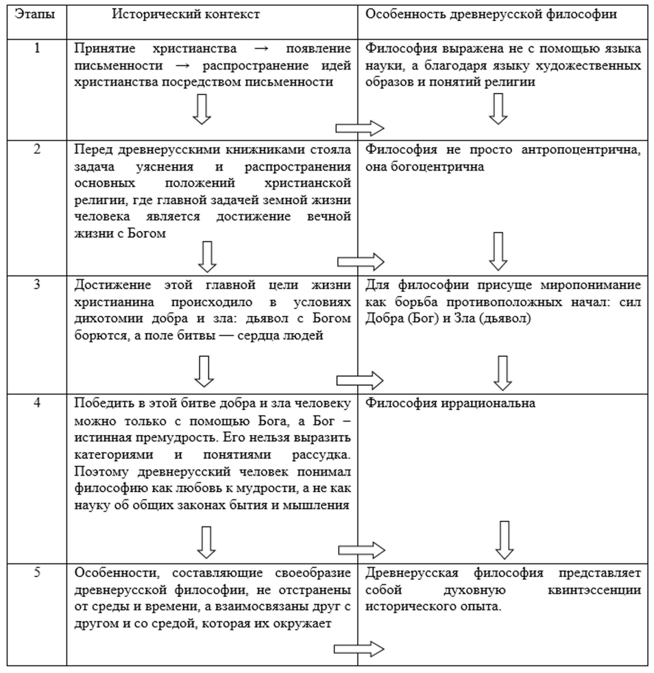 Подводя итог, выразим схематически выявленные нами особенности древнерусской философии в их взаимосвязи с историческим контекстом и предыдущим периодом (табл.).