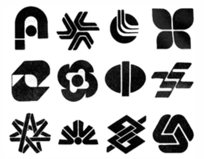 По данным изображениям видно, что у студентов проявилось видение предметов как знаков. Еще в процессе поисков перед студентами ставится задача – обобщать формы деталей предметов до простых геометрических фигур – круг, квадрат, треугольник, овал, трапеция, прямоугольник, как в изображении деталей, из которых состоит предмет, так и самой большой формы, внешних очертаний знака – сам знак должен компоноваться в большую геометрическую форму.