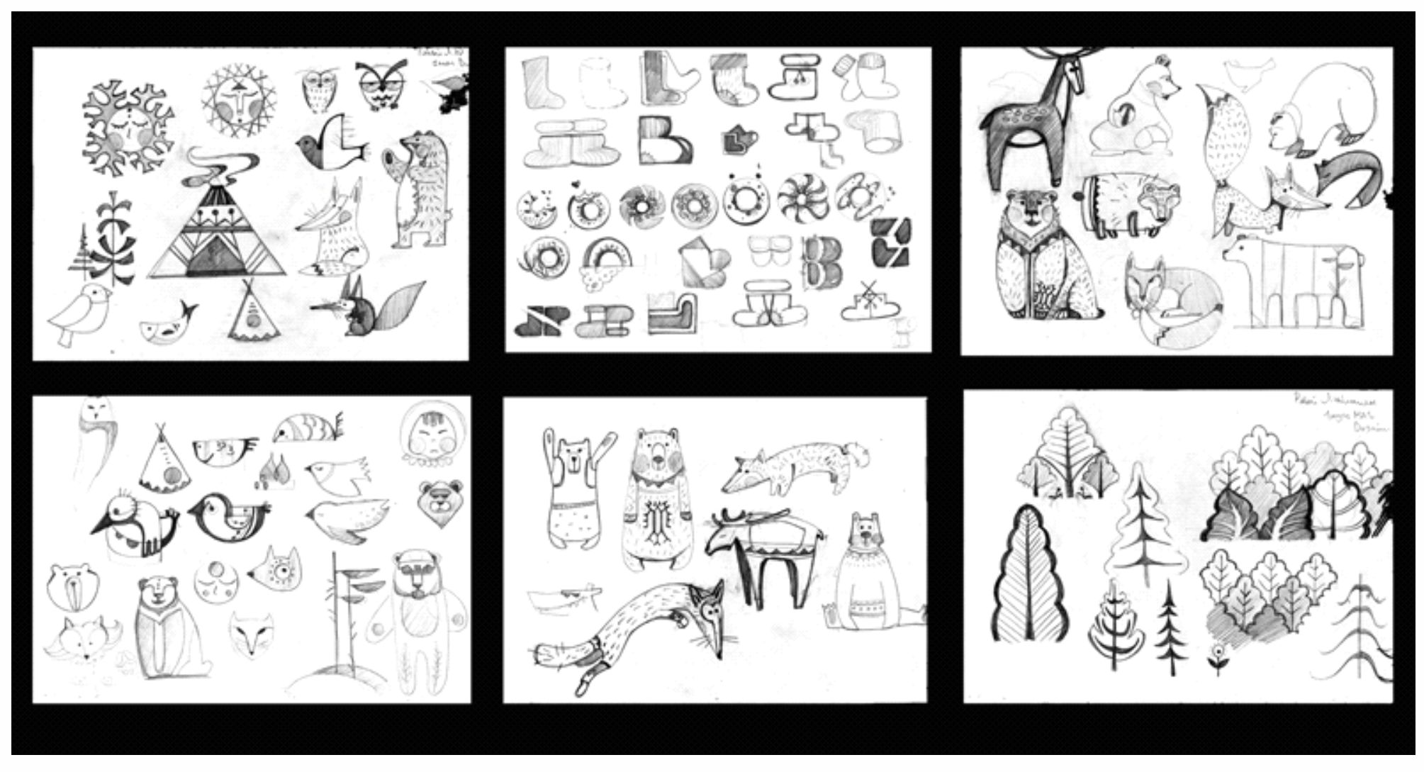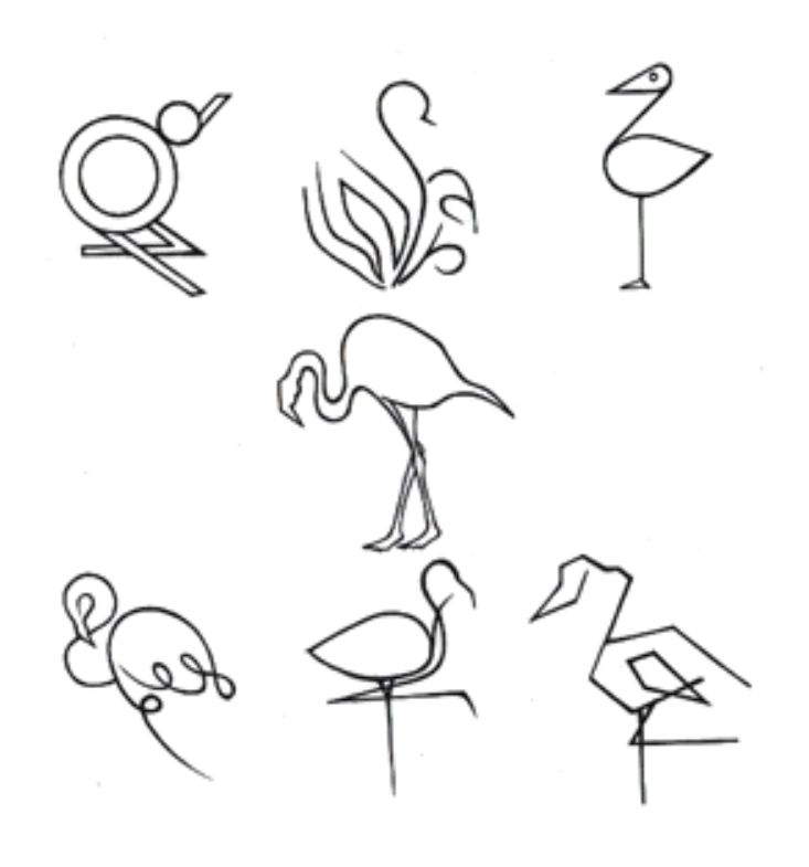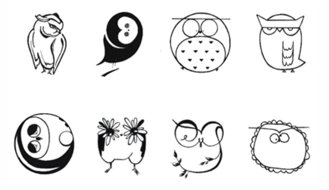 Казалось бы, что изобразить знак это просто. Но начинающий дизайнер, студент в начале испытывает большие трудности, так как он видит все окружающие предметы в трехмерном пространстве, в ракурсах, и со всеми характерными деталями. И потому пытается всё это воспроизвести, стараясь изобразить предмет максимально узнаваемым. В приведенных ниже поисковых набросках студента 2 курса Кандыба Анны видно, как происходит данный процесс (рис. 7).