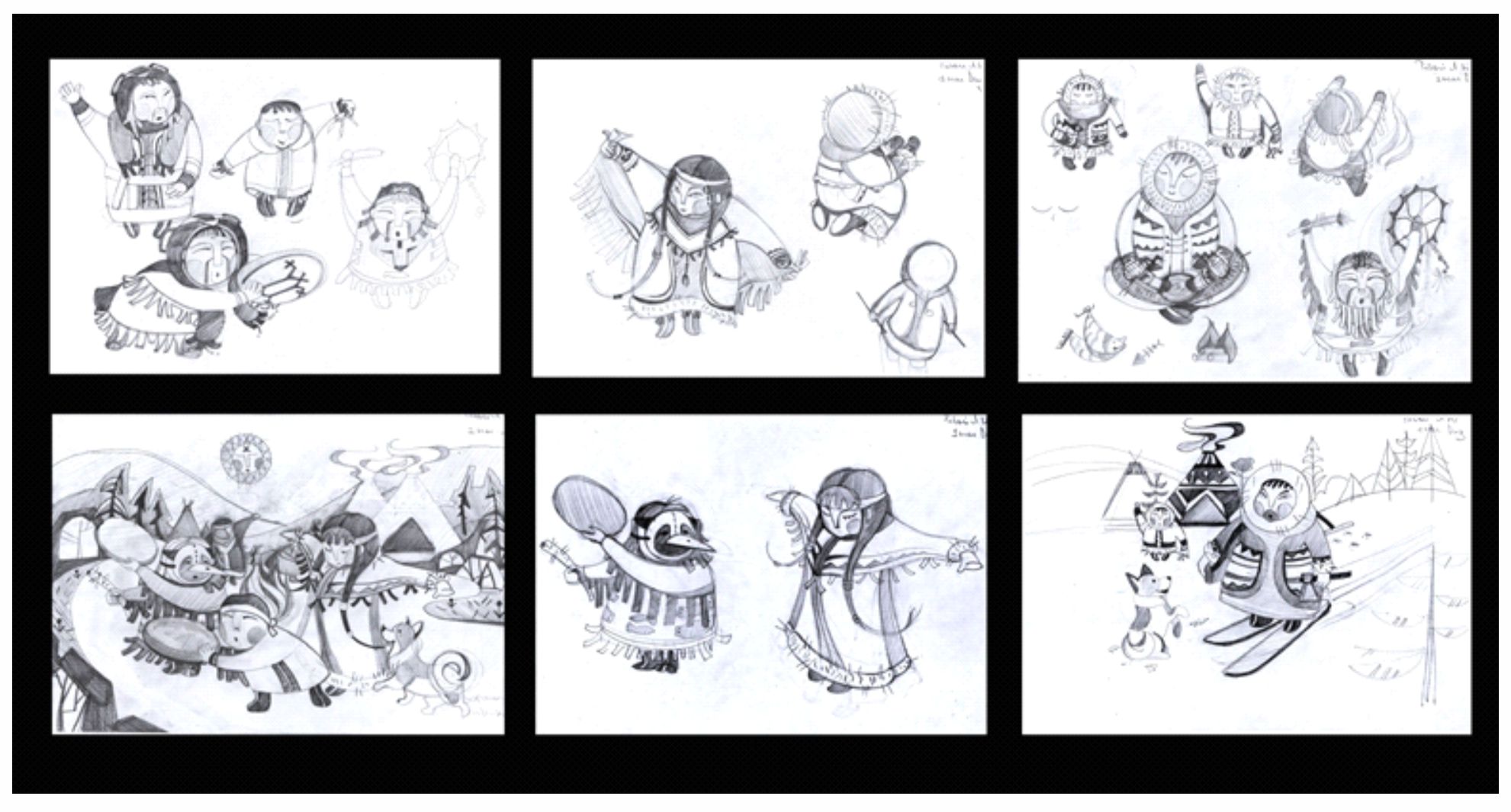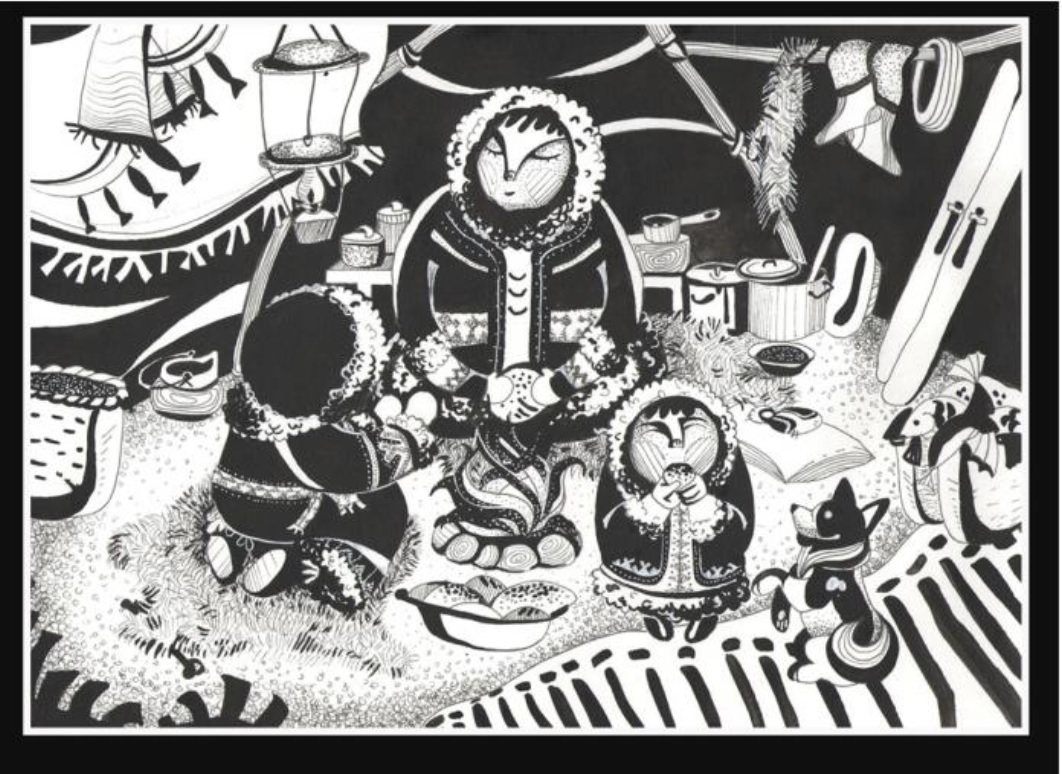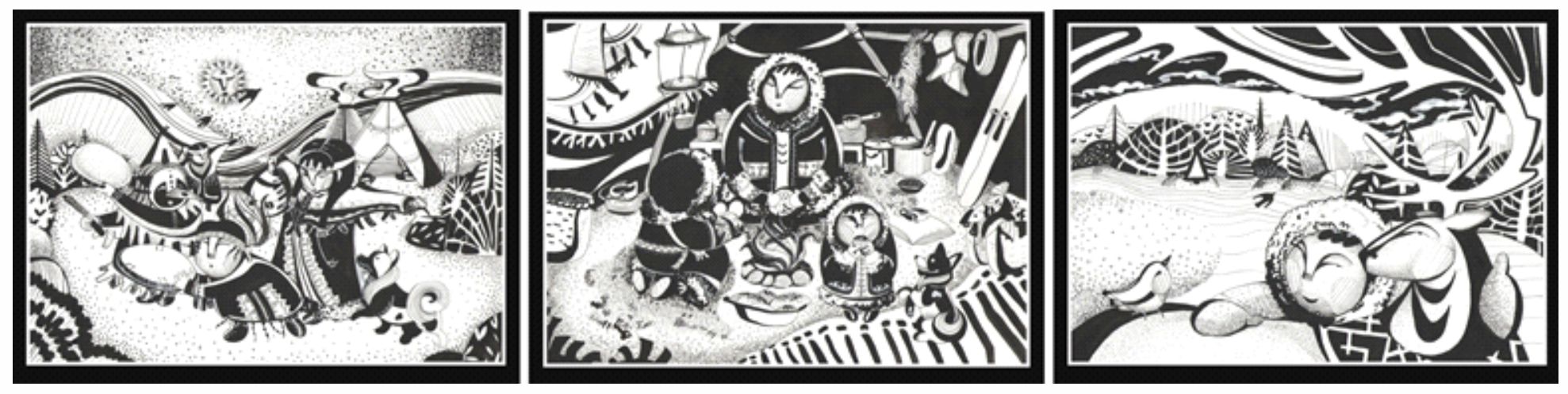 Далее в статье представлена вся последовательность создания декоративно-графических композиций, выполненных магистрантом 1 курса Рябой Людмилой, которая окончила бакалавриат по направлению «Средовой дизайн», где её обучали объемно-пространственному видению. Но, именно, выполненная ею последовательно композиция – очень прилежно, вдумчиво, начиная от знаков, стилизации всех предметов из задуманной композиции, позволили ей создать серию графических листов из жизни ханты. И в дальнейшем использовать созданные образы в выпускной квалификационной работе (рис. 14, 15, 16).