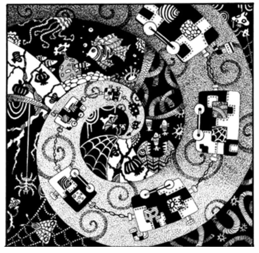 Объекты привязываются к друг другу посредством присоединения контуров. Здесь целостность добивается за счет того, что видим общую большую форму, общий абрис.