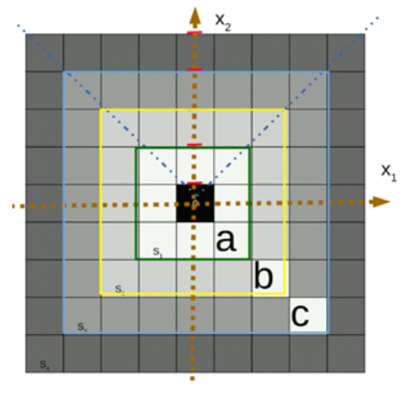 A set partition one can see above. On the other hand, this formula describes a one-dimensional probe penetrating three nested hypercubes through a common center. The result of the Cartesian Product of two orthogonal probes can be seen in Picture 2 above, so the researcher can obtain a two-dimensional plane regardless of the space dimension. There is no parallax effect.
