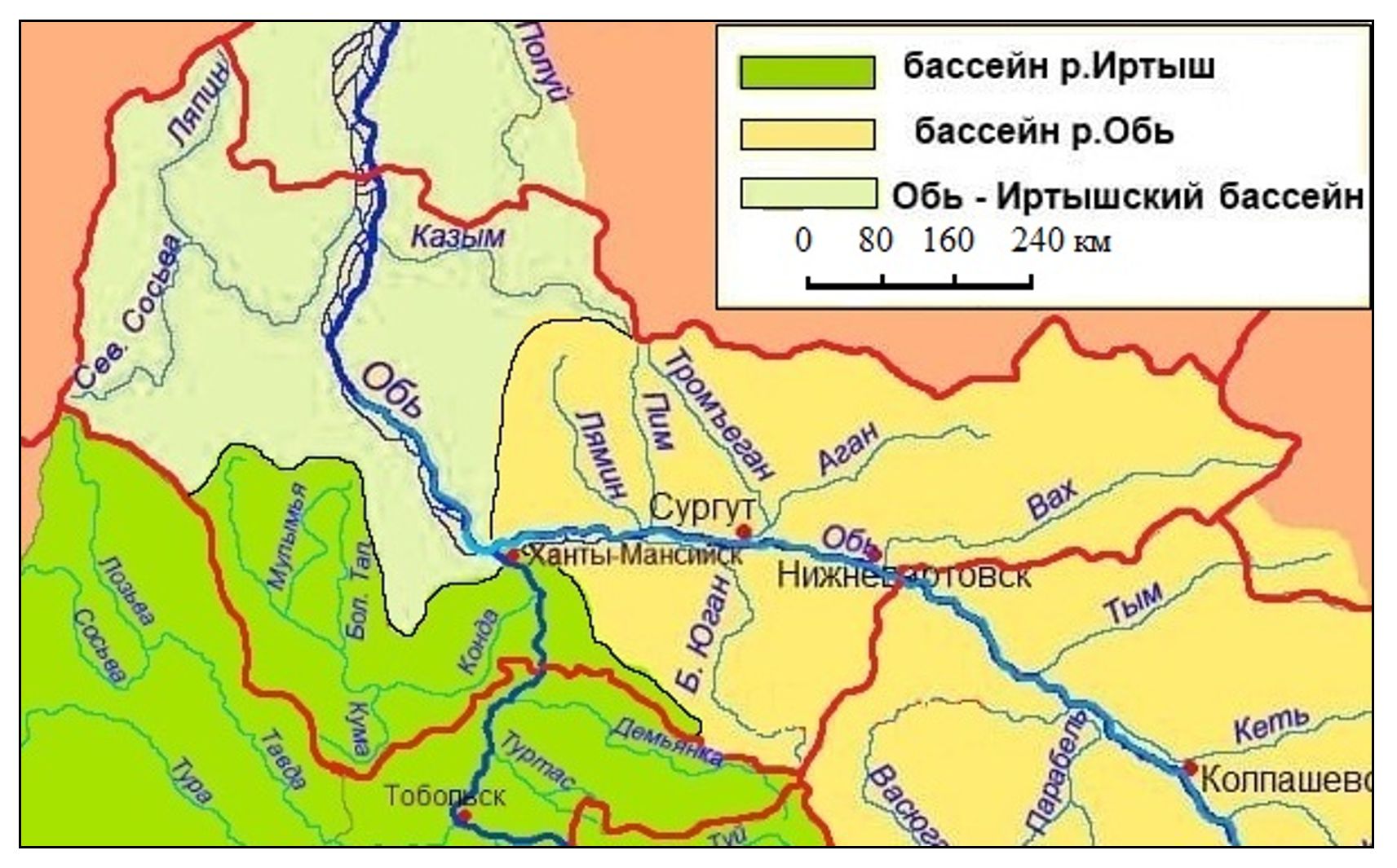 Рис. 1. Регион исследования: бассейн рек Иртыш и Обь в пределах Югры