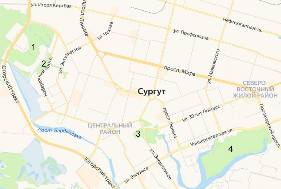 Рис. 1. Точки отбора образцов коры сосны в сосновых лесах парков г. Сургута: 1 – парк «Кедровый Лог»; 2 – парк «Нефтяник»; 3 – парк «Энергетиков»; 4 – парк «За Саймой»