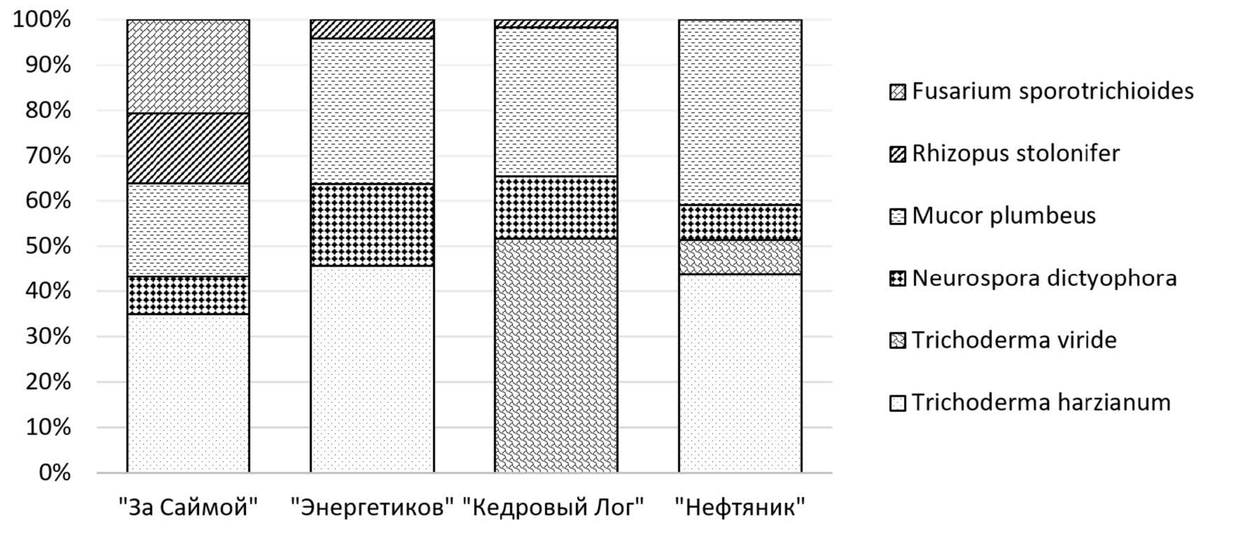 В результате исследований микобиоты коры сосны сосняков парков города Сургута выделено 10 изолятов почвенных микроскопических грибов, которые относятся к 6-ти видам, 5-ти родам. Аскомицеты представлены телеоморфным видом рода Neurospora – N. dictyophora, а также анаморфными видами рода Trichoderma (Т. harzianum, T. viride) и рода Fusarium (F. sporotrichioides); зигомицеты представлены видами двух родов семейства Mucorales – рода Mucor (M. plumbeus) и рода Rhizopus (R. stolonifer). Структура микоценозов коры сосны исследованных участков сосновых лесов представлена на рис. 2.