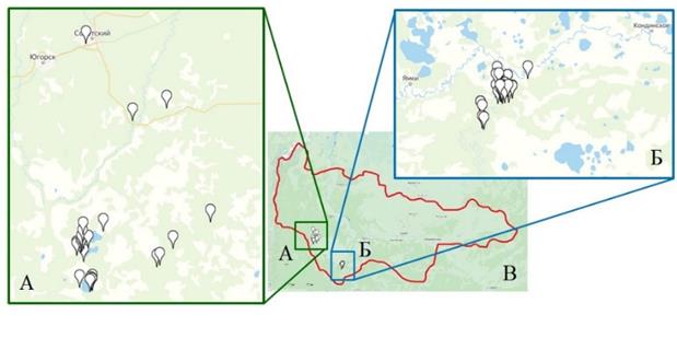 Рис. 1. Карта-схема сборов пресноводных моллюсков в бассейне р. Конда. А – район природного парка «Кондинские озера»; Б – район экспедиции в бассейн р. Кума; В – расположение районов сборов в границах Ханты-Мансийского автономного округа – Югры