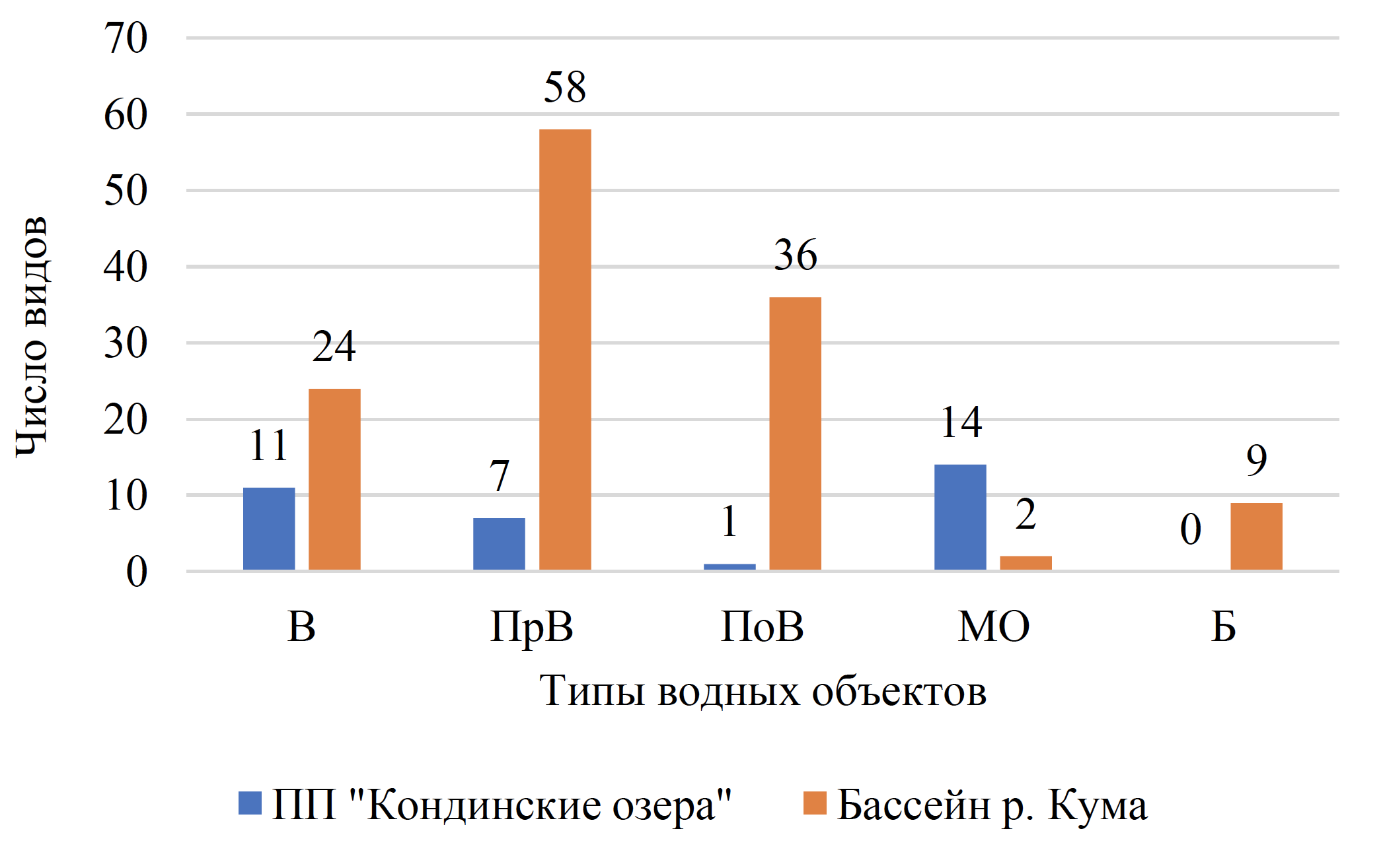 Распределение пресноводных моллюсков по типам местообитаний в обследованных районах существенно различалось. В ПП «Кондинские озера» и сопредельных районах наибольшее видовое богатство малакофауны отмечено в материковых озерах и водотоках, в бассейне р. Кума – в придаточных и пойменных водоемах. Во всех типах водотоков и водоемов, кроме материковых озер, видовое богатство моллюсков в бассейне р. Кума было выше, чем в природном парке и окрестностях (рис. 3).